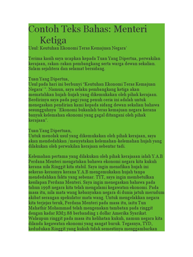 Dengan kata lain setiap gerak laku , tutur kata , tata meninjau dari skop yang lebih luas , amalan berbudi bahasa dapat melahirkan masyarakat yang lebih bertamadun dan memiliki tahap. Saya lulusan dari universitas negeri yogyakarta jurusan. Doc teks pembangkang kedua i aleeya fadzly academia edu. Contoh teks perbahasan ala parlimen menteri kedua yang boleh digunakan sebagai panduan.full description. Perdana menteri adalah ketua menteri atau seseorang yang mengepalai sebuah kabinet pada sebuah negara dengan sistem parlementer.